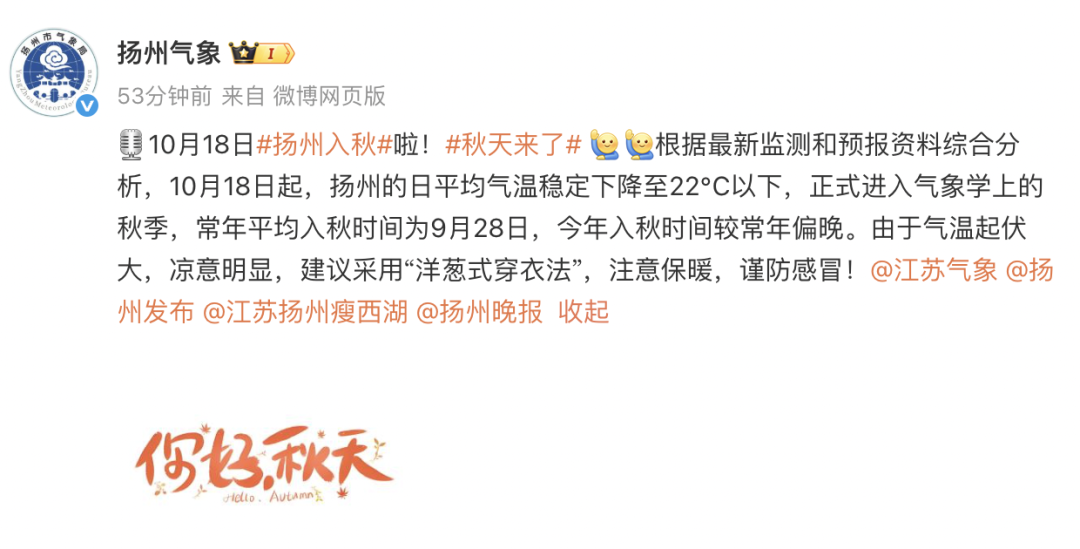 10℃!冷冷冷!扬州入秋了!刷新纪录