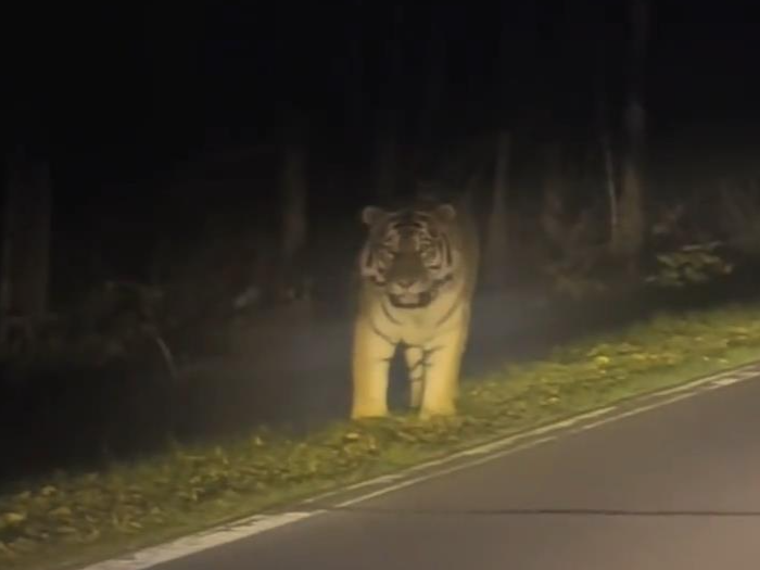 男子称自驾长白山国道遇野生东北虎,大喊“本地的”引老虎对视5秒