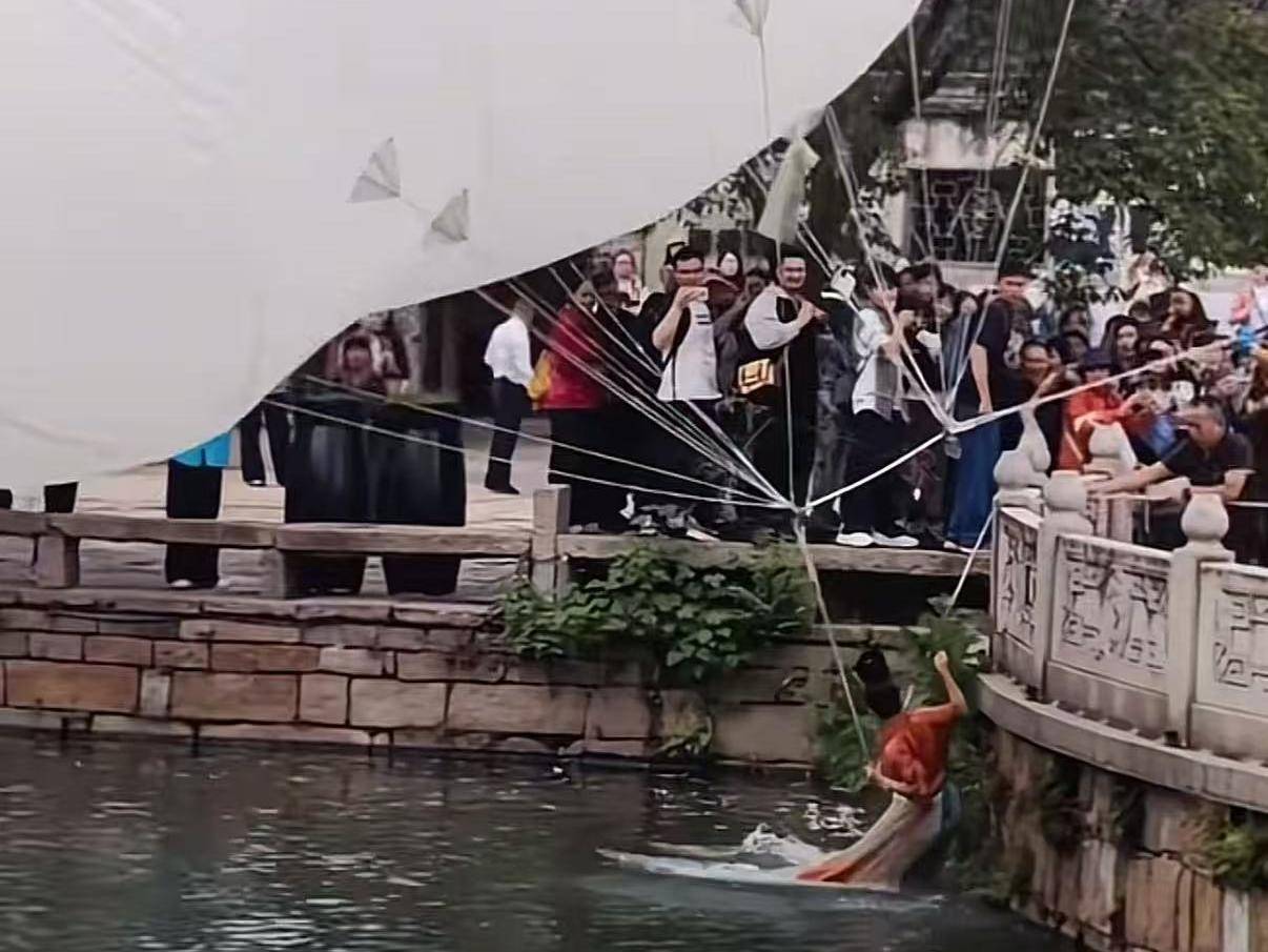 乌镇飞天女演员遇大风失控落湖,团队合力拉回获赞!景区工作人员:演员没事