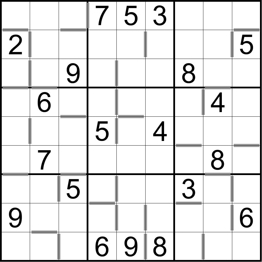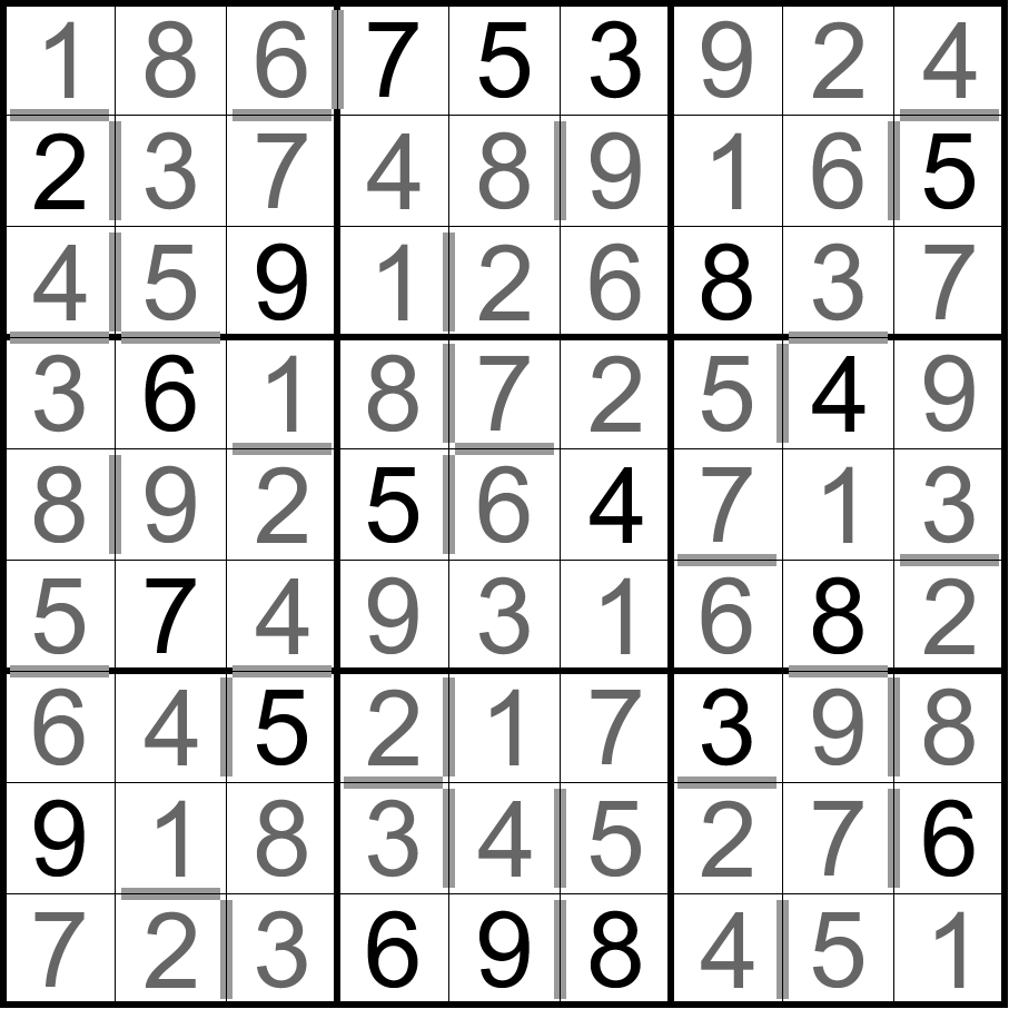 连续数独:将数字1-9填入空格内,使每行、每列和每宫内的数字均不重复。灰色粗线两侧格内数字之差为1,没有灰色粗线的相邻两格内数字之差不能为1。