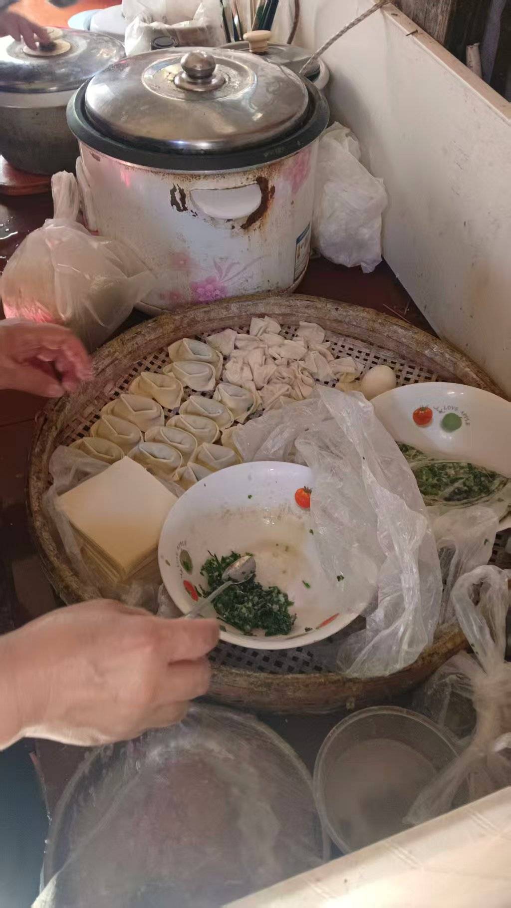操作台就在我们面前。一张旧木头桌子,竹筛占了一半。店小得有点拥挤,但足够我们五个人坐下来安静地看。我们看一位花白头发的老太太娴熟地包馄饨,看店里唯一的电器是一台小冰柜,看头顶吊着的灯泡发出昏黄的光,看几只热水瓶靠在墙边桌上,看门口的大煤炭上坐着大锅,看初冬的微雨落在门外的青石板上、落在小青砖墙上、落在小巷对过人家屋顶的瓦松上。