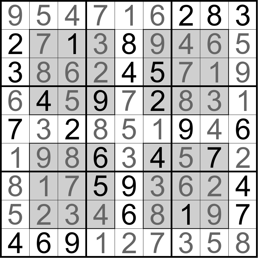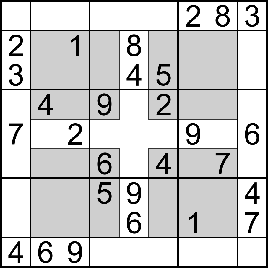 窗口数独:将数字1-9填入空格内,使每行、每列、每宫和四个灰色区域内的数字均不重复。