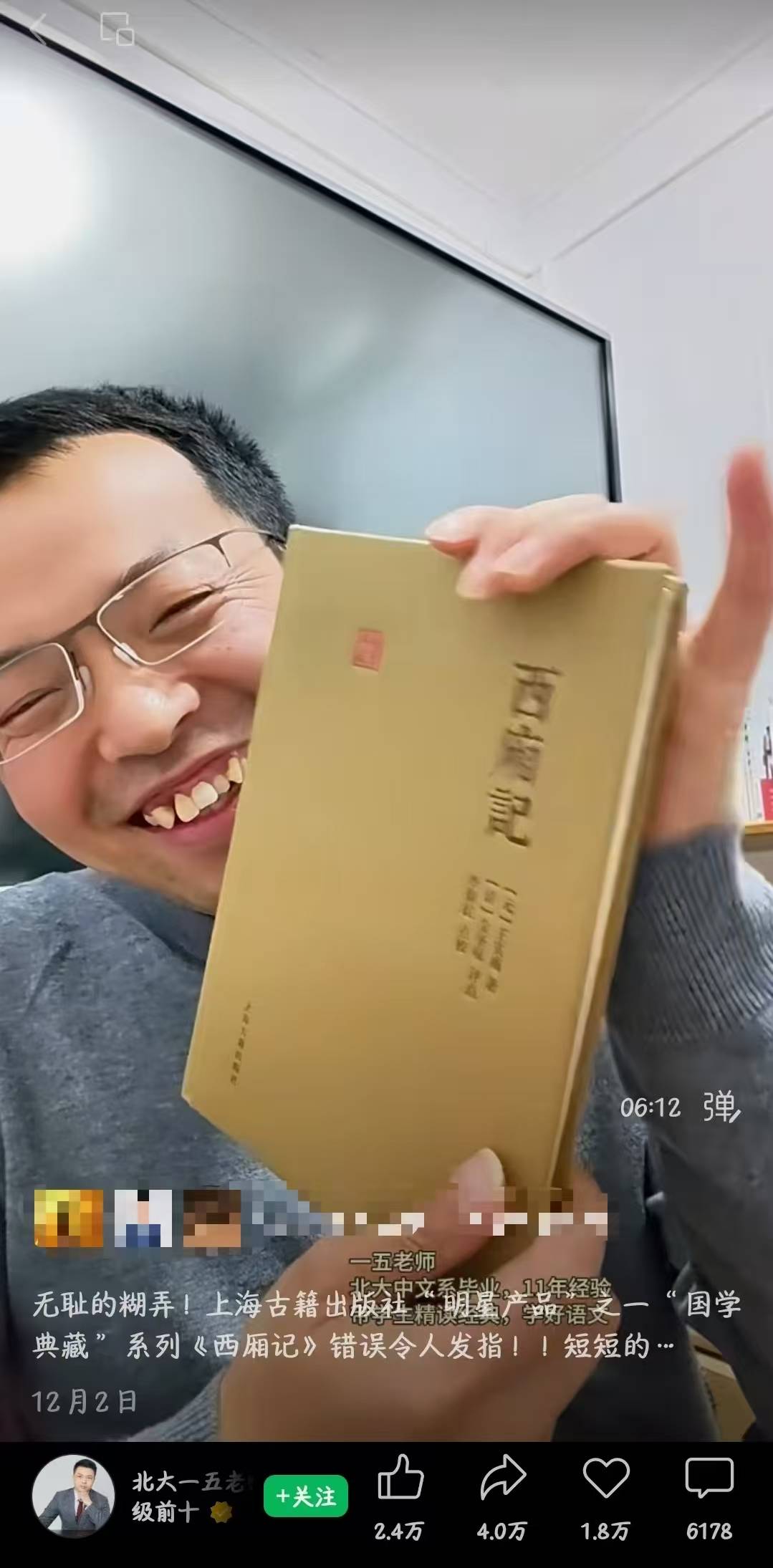 12月2日,教育博主“北大一五老师-只教班级前十”发布视频和长文,指责上海古籍出版社“明星产品”之一的“国学典藏”系列《西厢记》出现了众多错误,引发众多网友关注和讨论。