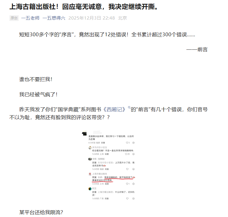 12月3日,博主再次发布视频和长文,认为上海古籍出版社的回应毫无诚意,“我决定继续开撕,谁也不要拦我!我已经被气疯了!”同时博主指责平台对自己的内容限流,认为上海古籍出版社的回复有避重就轻之嫌疑“你们说‘前言诸疑误’是想淡化问题吗?是想避重就轻吗?是想大事化小吗?是想逃避责任吗?”