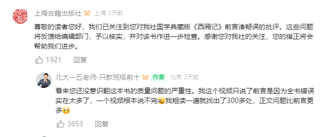 当日,上海古籍出版社在该博主视频的评论区留言,表示这些问题将反馈给编辑部门,予以核实,并对该书作进一步检查。博主回复:“看来您还没意识翻(注:原句为“翻”,应为“到”)这本书的质量问题的严重性。我这个视频只说了前言是因为全书错误实在太多了,一个视频根本说不完。”