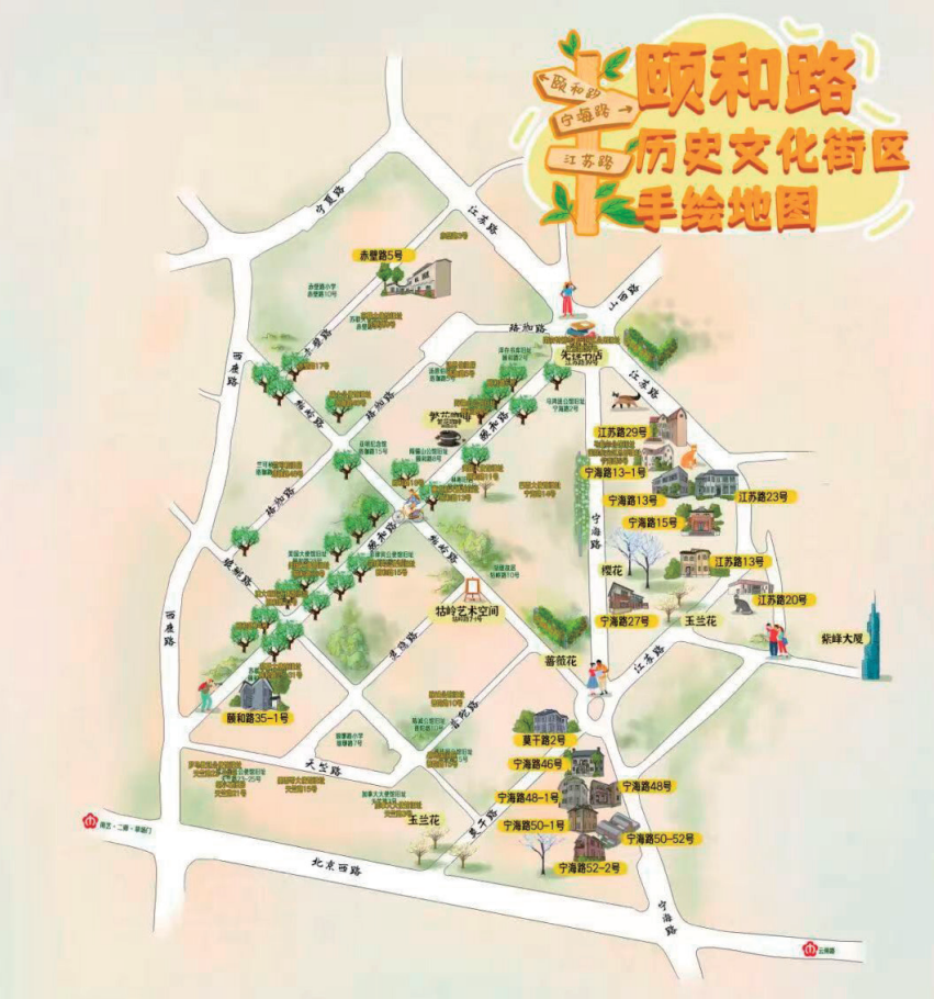 颐和路先锋书店里一款卡通版颐和路街区手绘地图,设计精美,图文并茂,民国建筑标注清晰,吃喝玩乐一看尽知,深受读者喜爱 。如今,南京许多旅游景点和历史文化街区都有自己的手绘地图,这些地图留存着南京城市记忆,也让人们感受到城市的温度 。南京摄影爱好者陆钦阳曾手绘一幅“南京民国公使馆导览图”,连同图片在微博上发布后,迅速在网上走红 。如比利时使馆、荷兰使馆、国际联欢社……这些隐匿在南京大街小巷的民国公使馆,恐怕不少老南京也不一定认识,但在这张手绘地图上都可以找到。