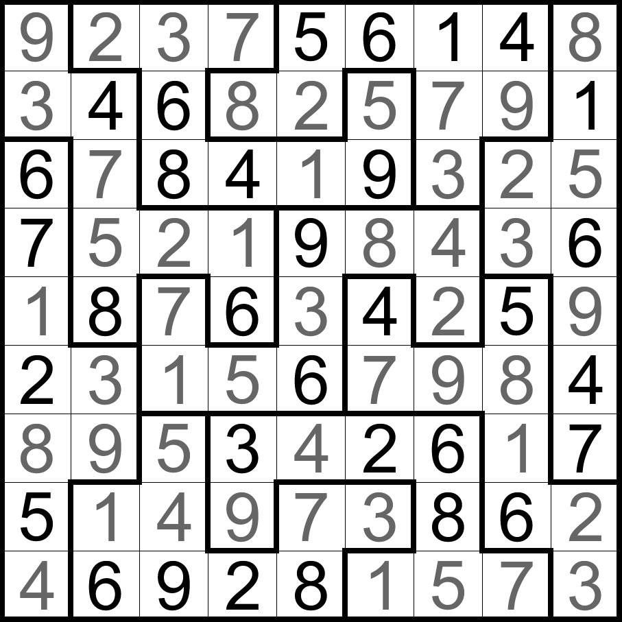 不规则数独:将数字1-9填入空格内,使每行、每列和每个不规则形粗线宫内的数字均不重复。