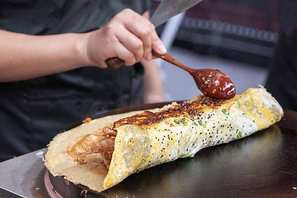 这当口,香气就猛地蹿出来了,是面食与热油交欢的焦香,混着鸡蛋质朴的醇厚。少年低着头,浓眉俊眼专注在锅底那一方天地,额前碎发散发着青春的、蓬松的气息,与锅里的烟火气融在一起。放上翠盈盈的生菜,铺上煎得微微卷边的肉肠,最后,才是那一勺鸡蛋饼的灵魂——自家调制的酱料。深赭色的酱,盛在敞口的白瓷缸里,他用小木刮板挑起稠厚的一抹,手腕旋转着,在蛋饼上画出一个匀净的圆。咸鲜里透着丝丝缕缕的甜,还有若有若无的香料气,瞬间统领了之前所有的香味。