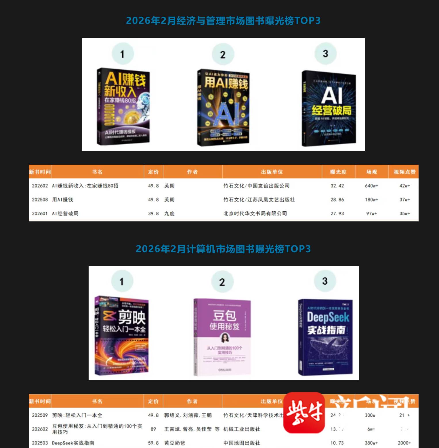 在北京开卷刚刚发布的二月营销图书曝光榜中,AI图书成为热点。借势春晚,《豆包使用秘笈:从入门到精通的100个实用技巧》成为当月曝光焦点,与《剪映:轻松入门一本全》《DeepSeek实战指南》等AI工具相关图书共同掀起技术应用热潮,而经济与管理类头部曝光图书也是围绕AI赚钱、AI经营相关图书,《AI赚钱新收入:在家赚钱80招》《AI经营破局》等图书曝光量大涨。这些营销宣传具有一个共同特点:精准捕捉大众在技术爆炸时代的集体焦虑——既担心被AI浪潮抛弃,又渴望能轻松驾驭新技术。开卷分析认为,这股浪潮充分反映大众在AI普及背景下,对工具学习、变现技巧等实用型内容的强烈需求。