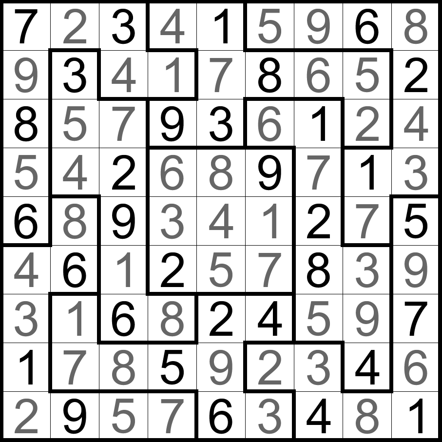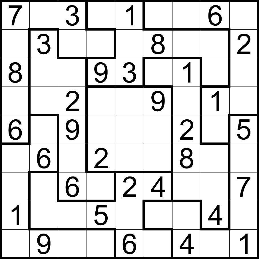 不规则数独:将数字1-9填入空格内,使每行、每列和每个不规则形粗线宫内的数字均不重复。