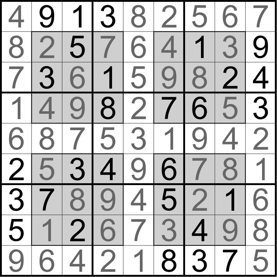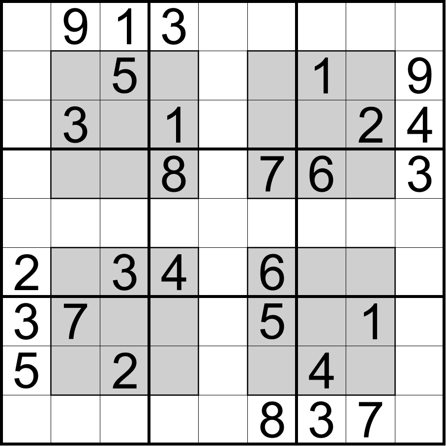 窗口数独:将数字1-9填入空格内,使每行、每列、每宫和四个灰色区域内的数字均不重复。