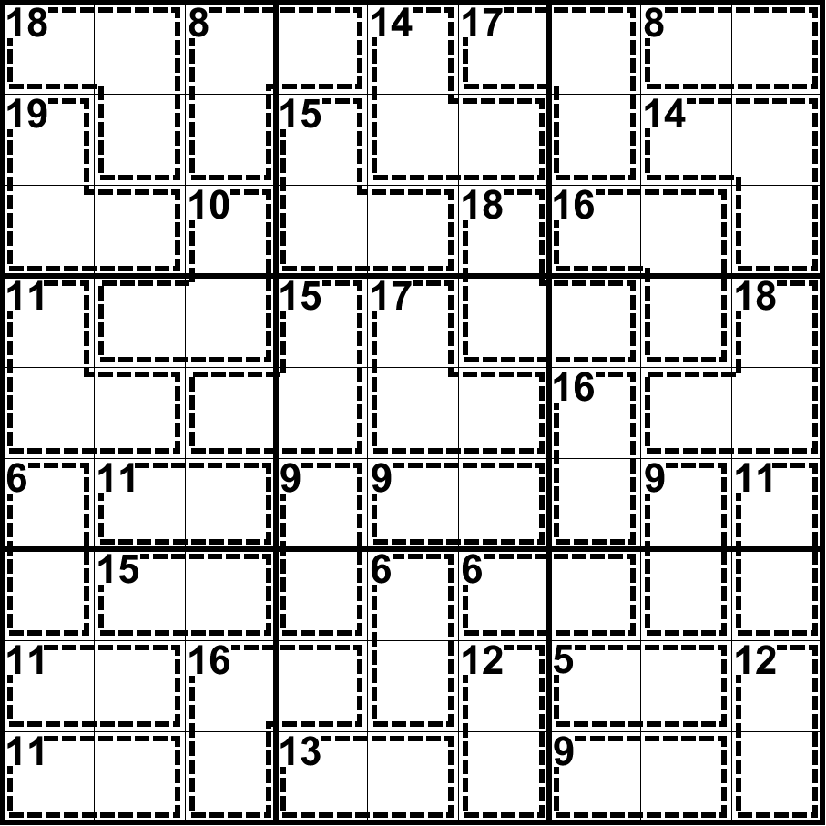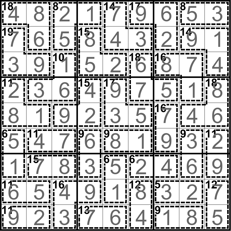 杀手数独:将数字1-9填入空格内,使每行、每列和每宫内的数字均不重复。虚线框内提示数表示框内所有数字之和, 同虚线框内不能填入相同的数字。