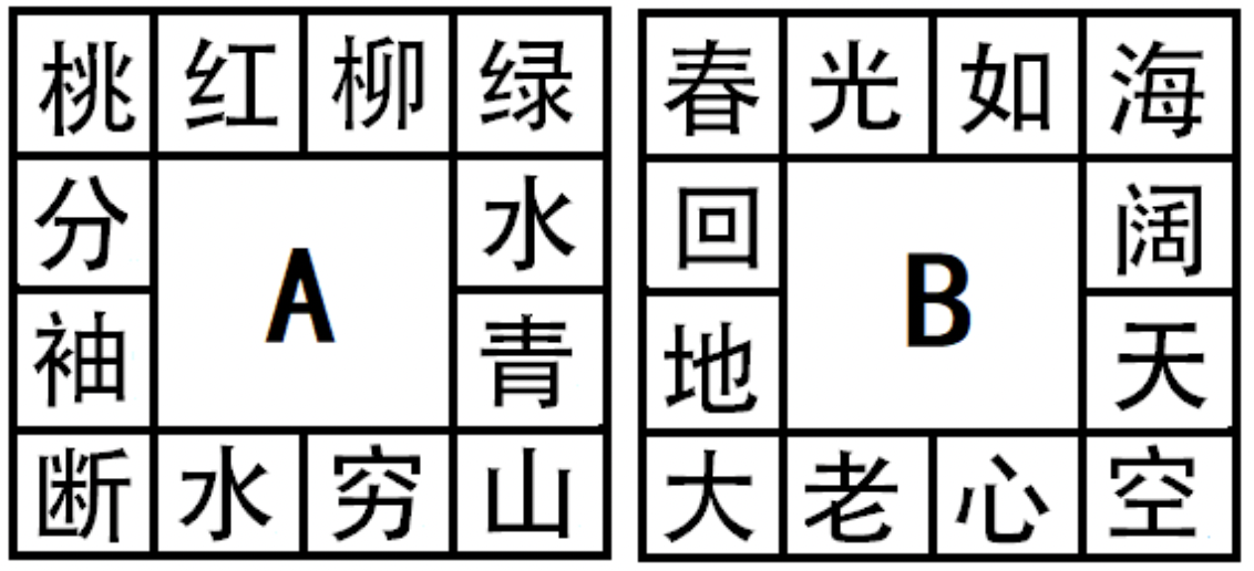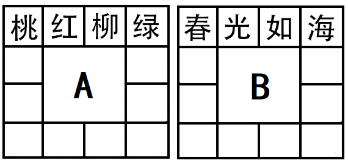 阳春四月,桃红柳绿,春光如海。请在下面A、B图中,每组从右上角的字开始,按顺时针方向,至左上角的字结束,在空格内填入恰当的字,使每组分别组成四句首尾相接的成语。