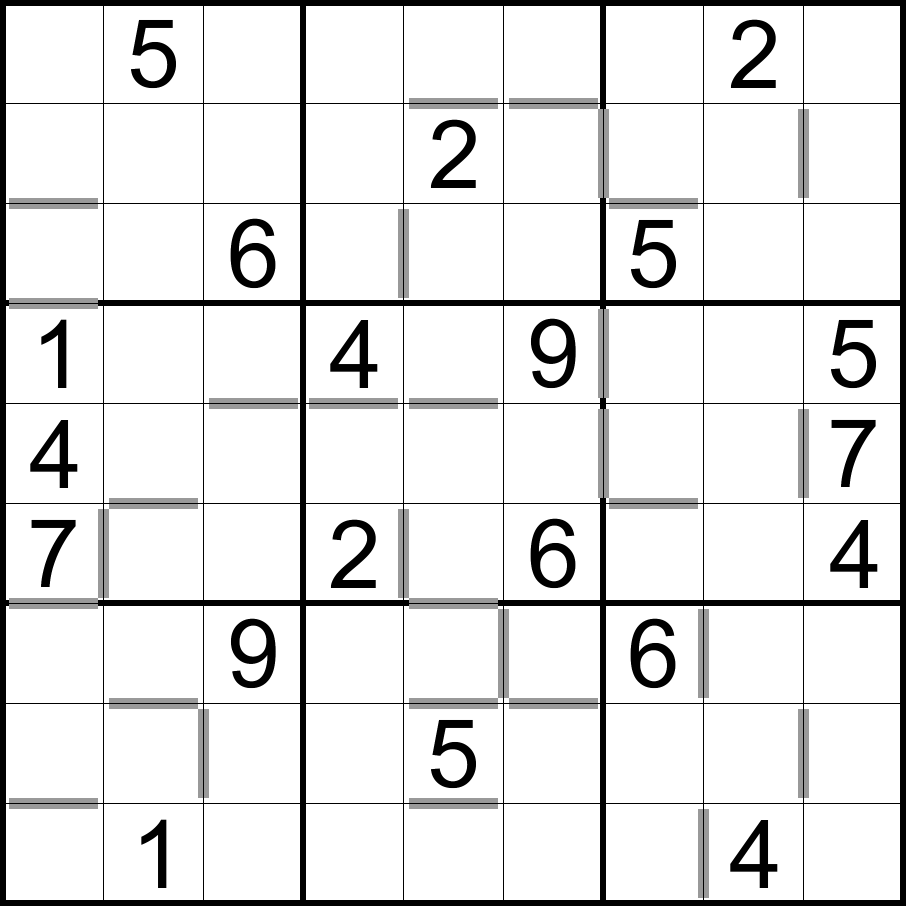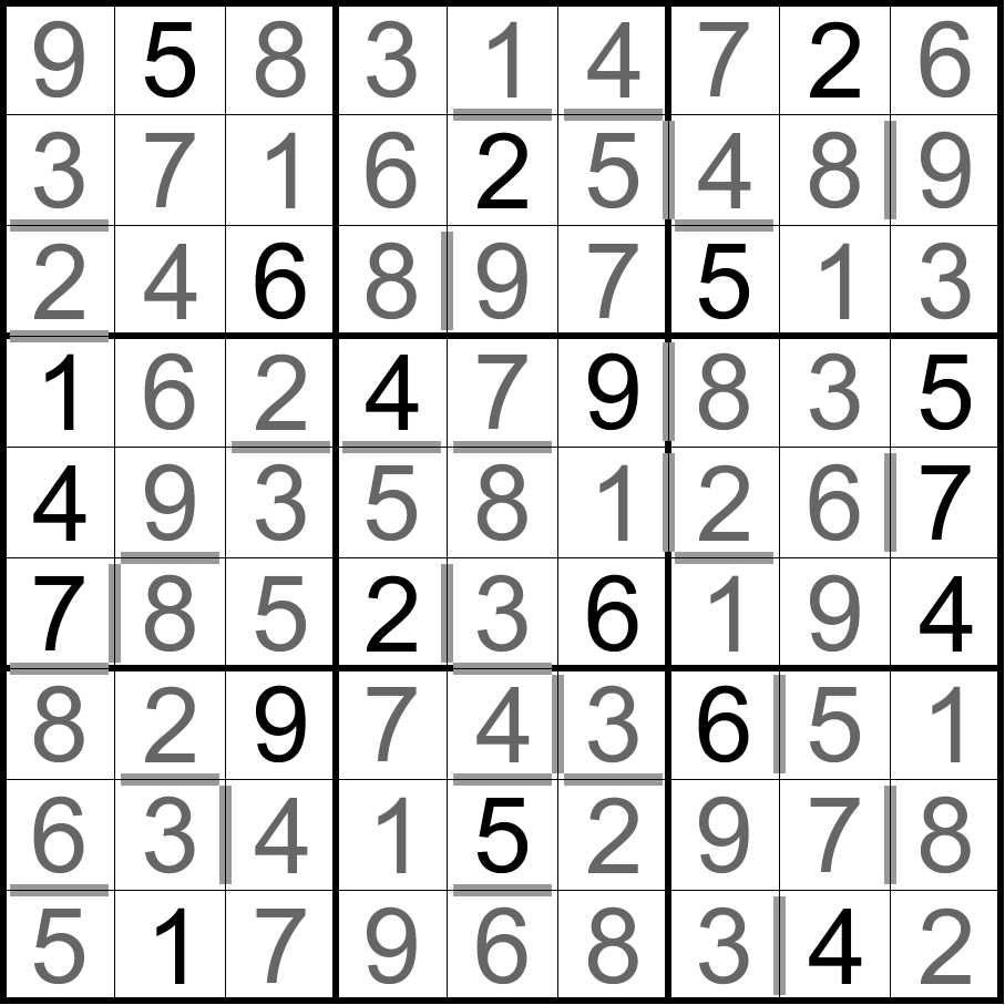 连续数独:将数字1-9填入空格内,使每行、每列和每宫内的数字均不重复。灰色粗线两侧格内数字之差为1,没有灰色粗线的相邻两格内数字之差不能为1。