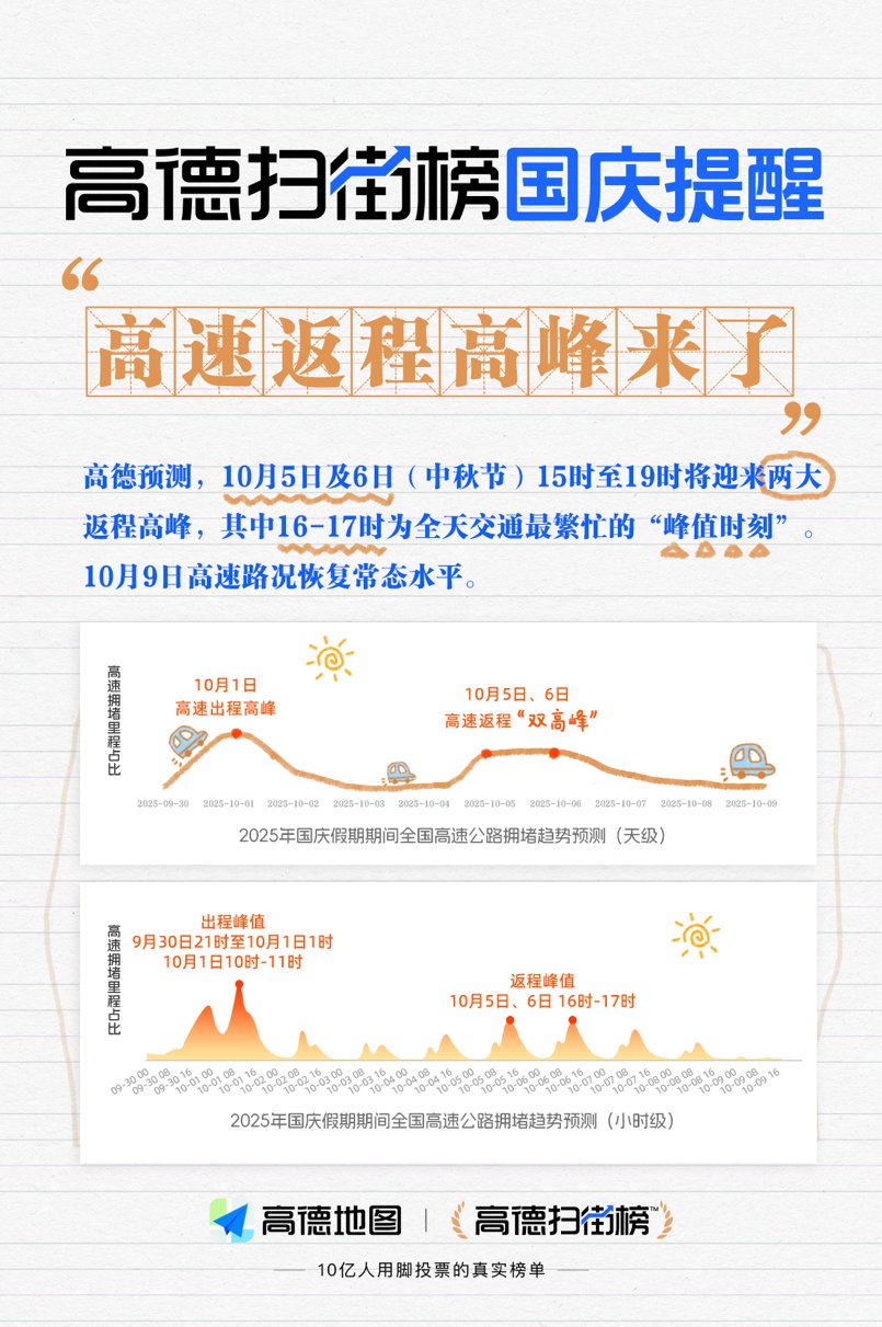 2025年国庆中秋⻓假,首波返程高峰已经来了?10月5日,高德结合全网实时路况与交通大数据,发布返程预测显示:10月5日及6日(中秋节)15时至19时将迎来两大返程高峰,其中16-17时为全天交通最繁忙的“峰值时刻”。建议返程用户提前规划时间与路线,避免赶上下午高峰时段。