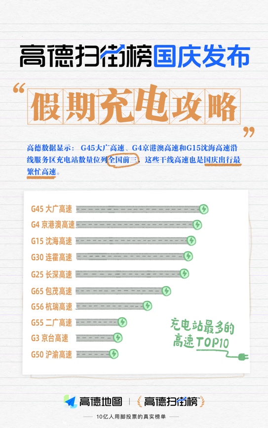 具体而言,广东是全国服务区内充电站数量最多的省份,河南、浙江、河北和安徽四省也跻身前五; G45大广高速、G4京港澳高速和G15沈海高速沿线服务区充电站数量位列全国前三,这些干线高速也是国庆出行最繁忙高速。