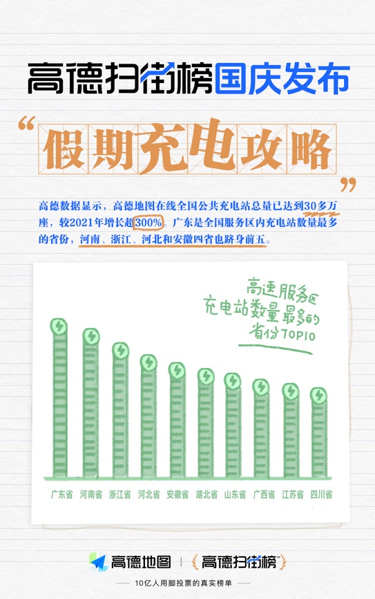 数据显示,高德地图在线全国公共充电站总量已达到30多万座,较2021年增长超300%。