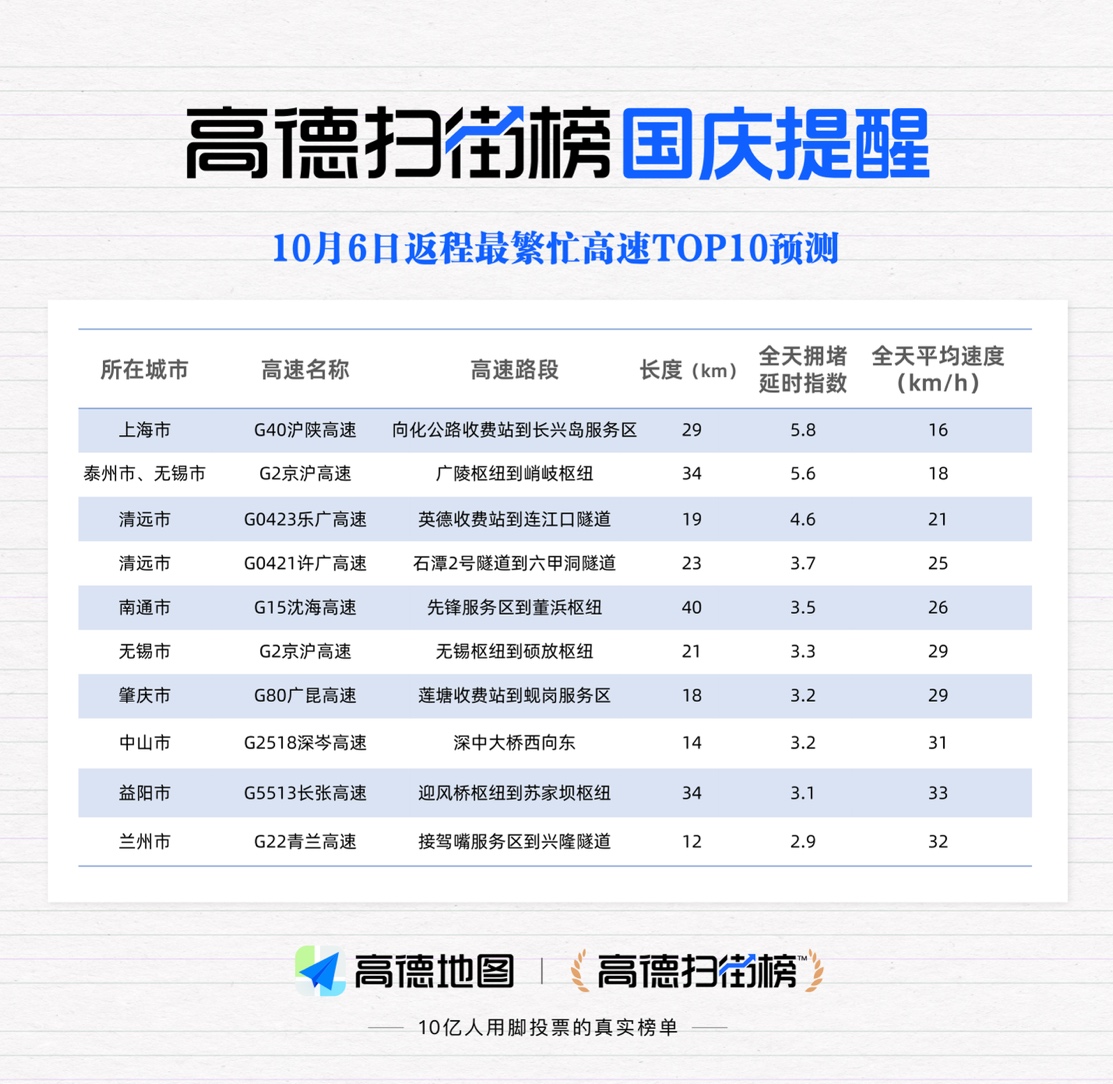 高德预测,10月6日中秋节当天的全国10大最繁忙的路段,主要集中在长三角、珠三角地区,其中G40沪陕高速上海段(向化公路收费站到长兴岛服务区)居第一位,拥堵延时指数5.8。此外,G2京沪高速泰州-无锡段(广陵枢纽到峭岐枢纽)、G0423乐广高速清远段(英德收费站到连江口隧道)也将面临显著交通压力。