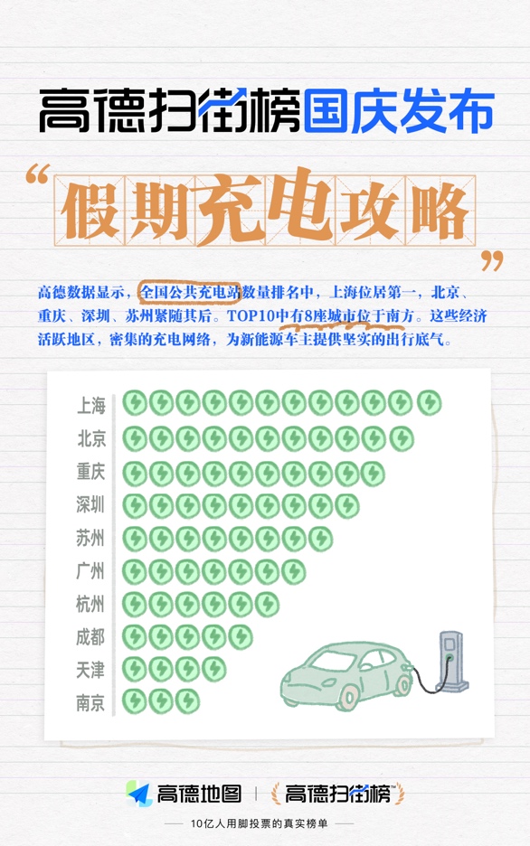 在全国公共充电站数量排名中,上海位居第一,北京、重庆、深圳、苏州紧随其后,南京也在前十,南方城市占据TOP10中的8席。这些经济活跃地区,密集的充电网络,为新能源车主提供坚实的出行底气。