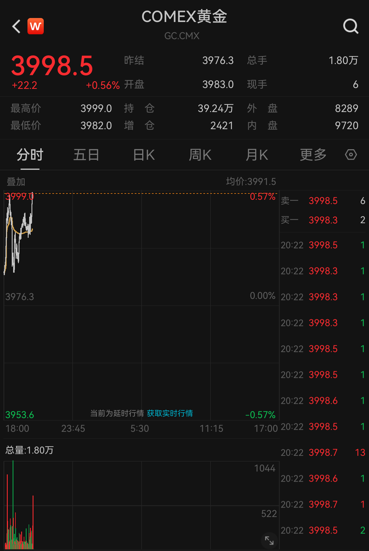 纽约期金首次触碰4000美元/盎司,年内大涨逾50%