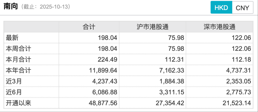 值得注意的是,尽管指数波动显著,但南向资金逢低大举买入港股,全天净买入港股达198.04亿港元,创下8月5日以来南向资金最大净买入规模。