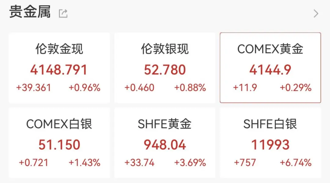 14日,COMEX黄金期货价格同样走高,一度升破4150美元/盎司,再创历史新高。