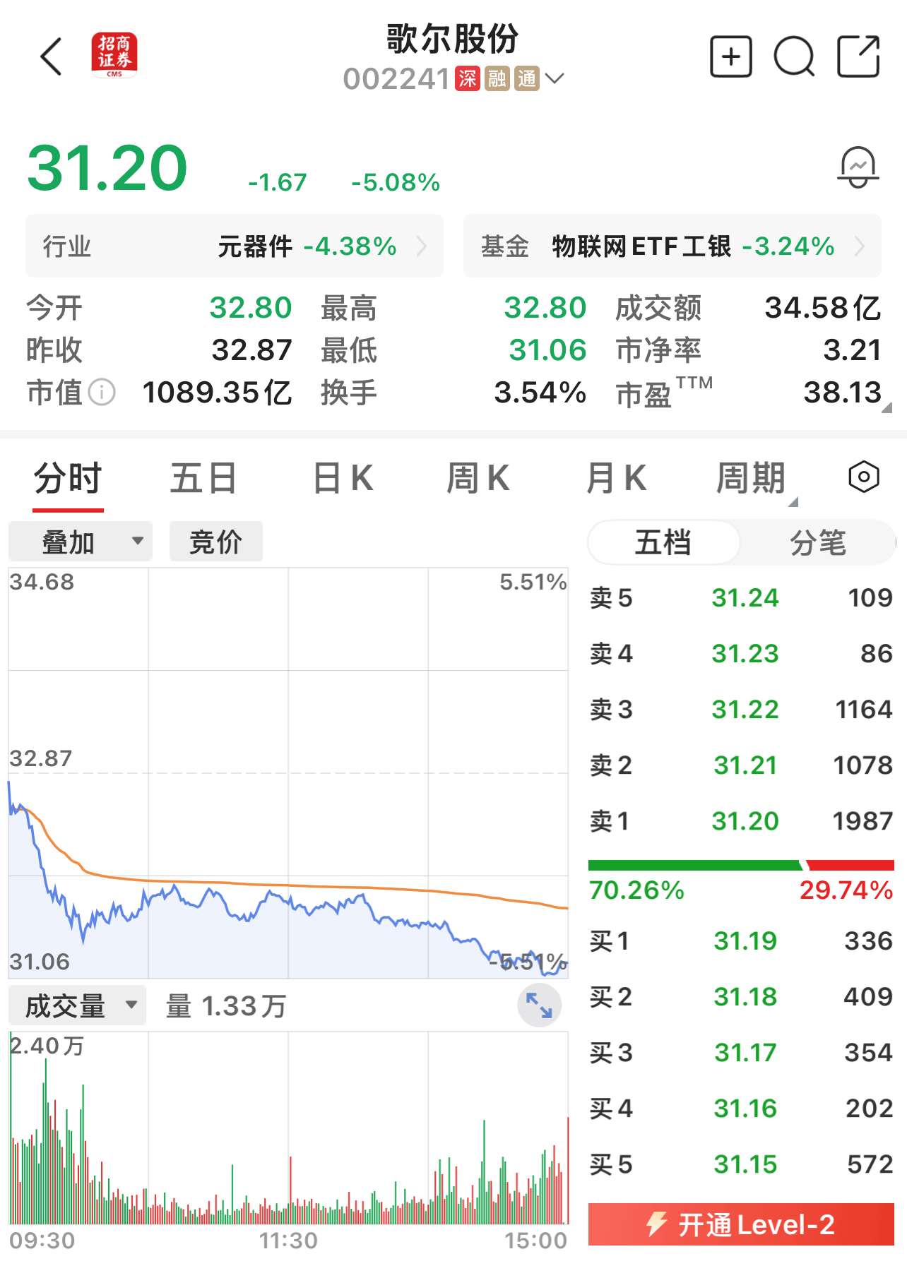 歌尔股份总市值1089.35亿元