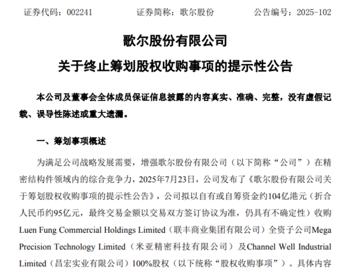 该收购案于2025年7月22日晚首次披露,歌尔股份发布公告称,公司与香港联丰商业集团达成初步意向,拟以自有或自筹资金约104亿港元(折合人民币约95亿元)收购其全资子公司米亚精密科技有限公司及昌宏实业有限公司100%股权。