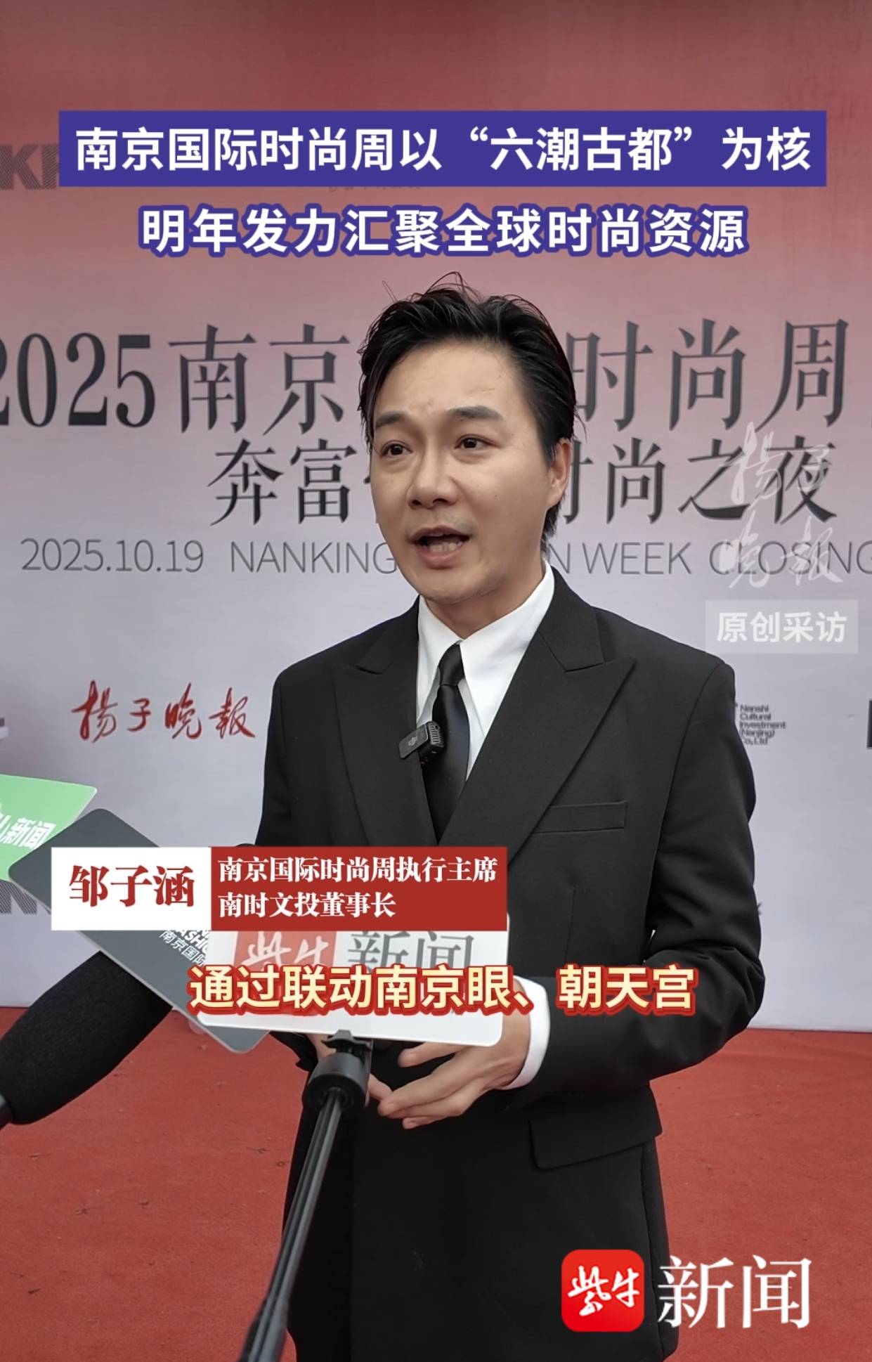 2025南京国际时尚周闭幕大秀开场前,扬子晚报/紫牛新闻记者专访了南京国际时尚周执行主席、南时文投董事长邹子涵,他表示未来时尚周活动将致力于成为南京城市活力的重要窗口,更加国际化。
