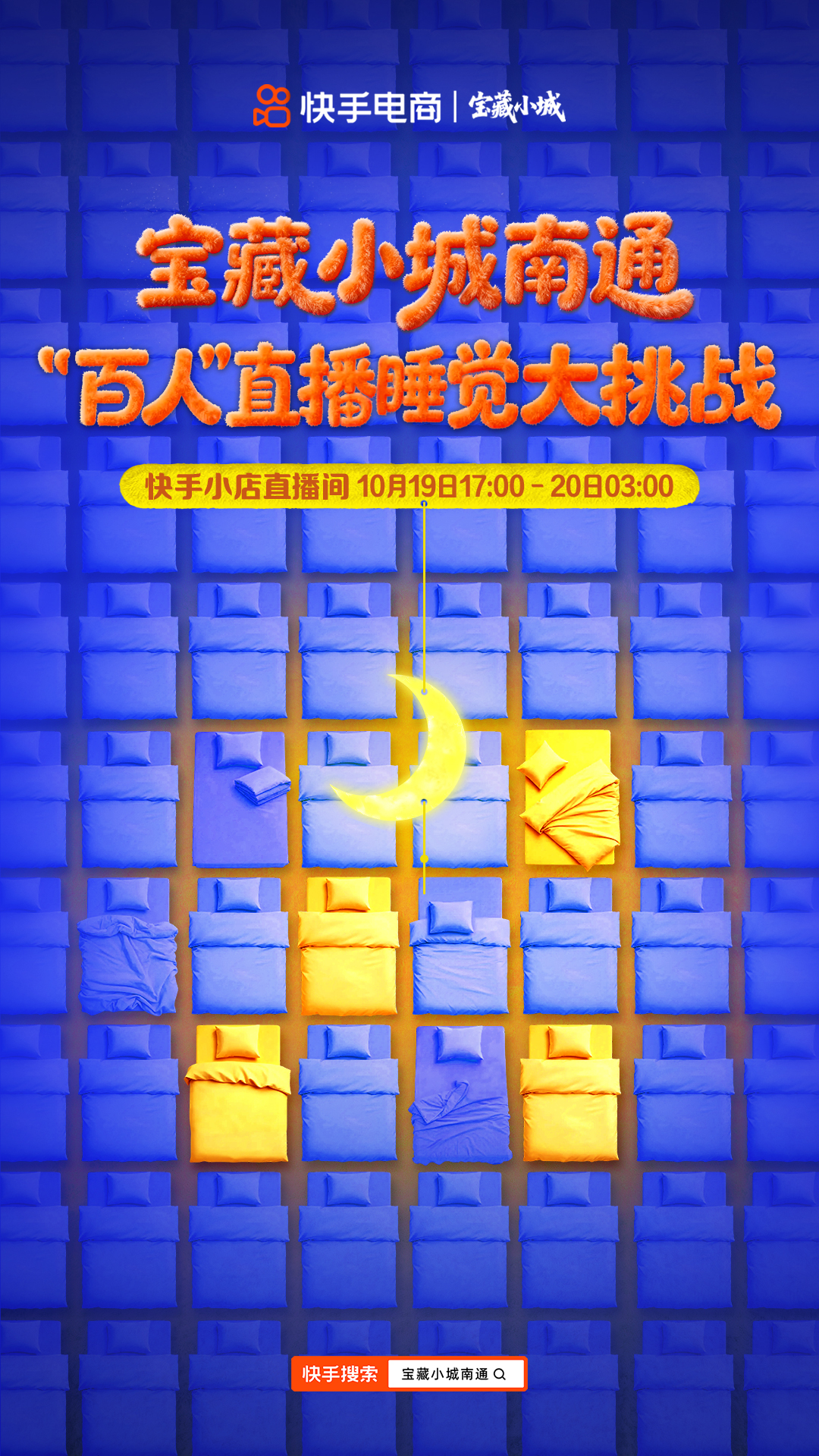 此次活动期间,为打造线上线下的多重声量,10月19日,快手电商将在南通家纺城“百人”直播睡觉大挑战,并在快手小店快手号同步直播。