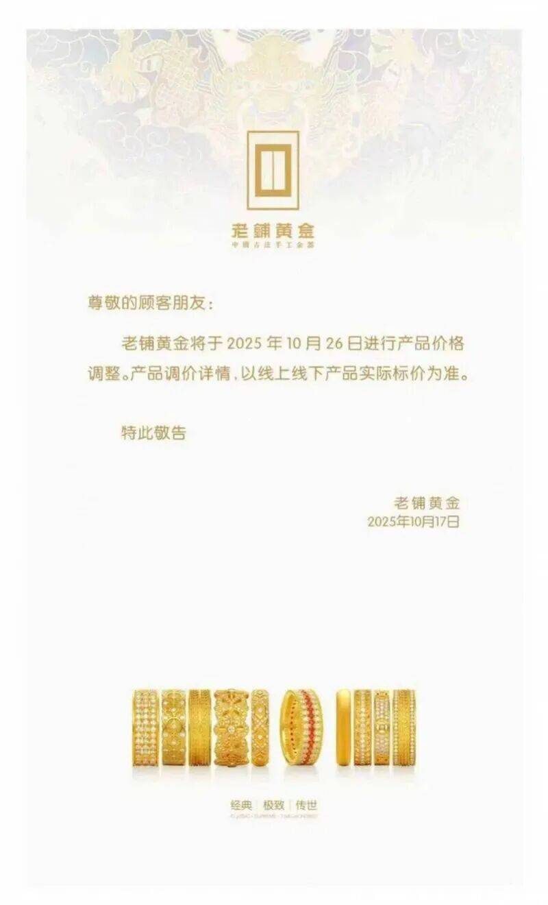10月17日,老铺黄金发布调价预告称,将于10月26日进行产品价格调整。具体调整幅度与范围,将以线上线下门店实际标价为准。
