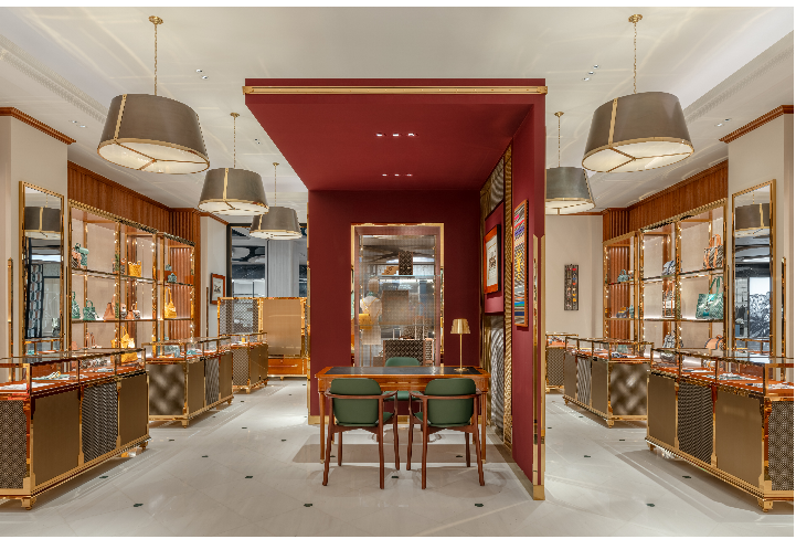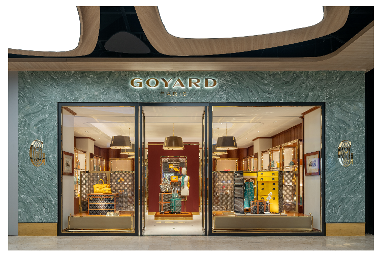 步入Goyard新店,仿佛走进一座当代私人收藏馆。所有商品被精心安置于胡桃木制成的展架上,拉丝黄铜配件与天鹅绒衬里相映成趣,恍若步入法国古董图书馆的珍藏室。白、灰与墨绿色调的意大利大理石地面,与深绿、酒红的墙面点缀形成精妙对比,营造出内敛而温暖的气氛。“我们想要打造的是一个‘家’,而非单纯的卖场。”品牌方透露,“每一处细节都在诉说品牌172年的历史。”
