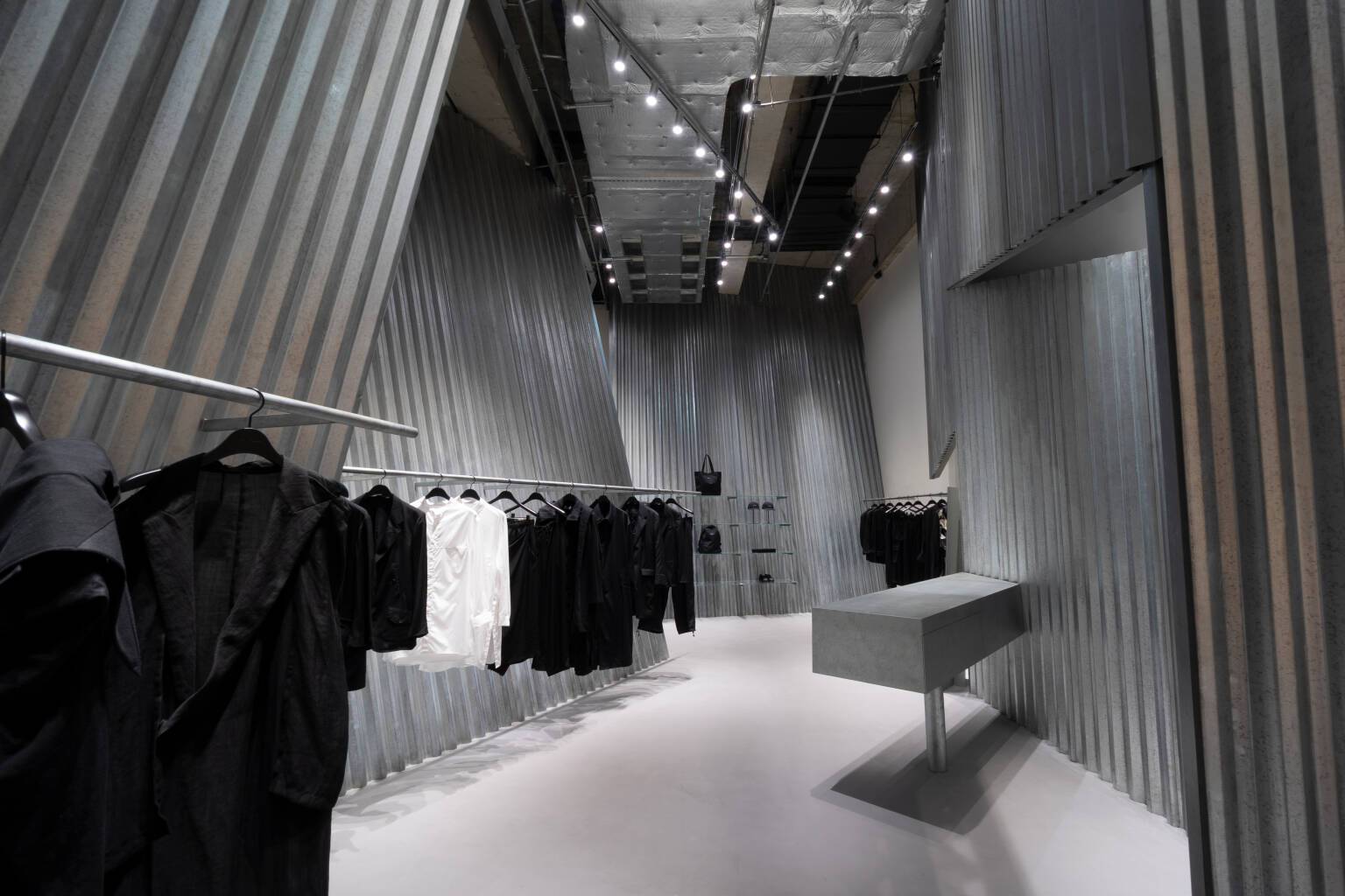 与之形成鲜明对比的是山本耀司的金属诗意。店铺墙面采用定制手工镀锌波纹钢板,最高达五米的金属板材以纵向阵列矗立,复刻着南京明城墙的肌理与韵律。设计团队OSO从14世纪古城墙中汲取灵感,将冷峻金属与手工锻造的痕迹交织,创造出前卫而富有温度的氛围。山本耀司店铺负责人表示,“我们不是在销售产品,而是在构建一个能与城市对话的空间。”“这些波纹钢板不仅是装饰,更是对南京历史的致敬。”