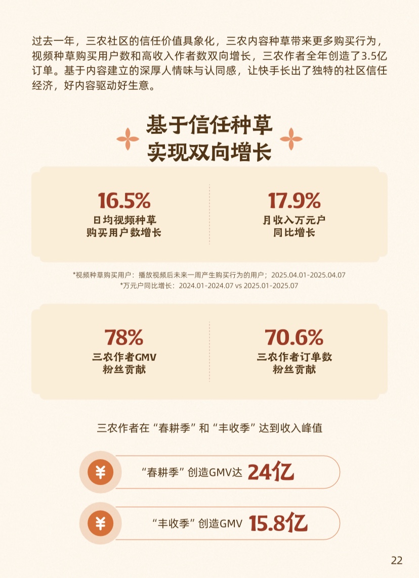 基于内容所建立的人情味与认同感,逐渐孕育出独特的“社区信任经济”。过去一年,平台三农作者共产生3.5亿笔订单,用户通过视频“种草”下单的规模持续扩大,日均视频种草购买用户数增长16.5%,月入过万的创作者数量也同步提升17.9%。尤为值得注意的是,三农创作者总GMV中有78%由粉丝贡献。