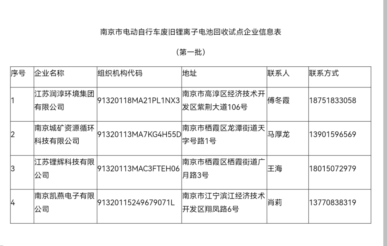 10 月 31 日,记者从南京市工信局获悉,根据国家及省、市关于电动自行车全链条安全整治工作部署,提升电动自行车废旧锂离子电池安全管理水平,经征集、审核和公示,初步确定了第一批次4家电动自行车废旧锂离子电池回收试点企业名单。有需要的群众可根据实际情况,就近选择回收企业办理。