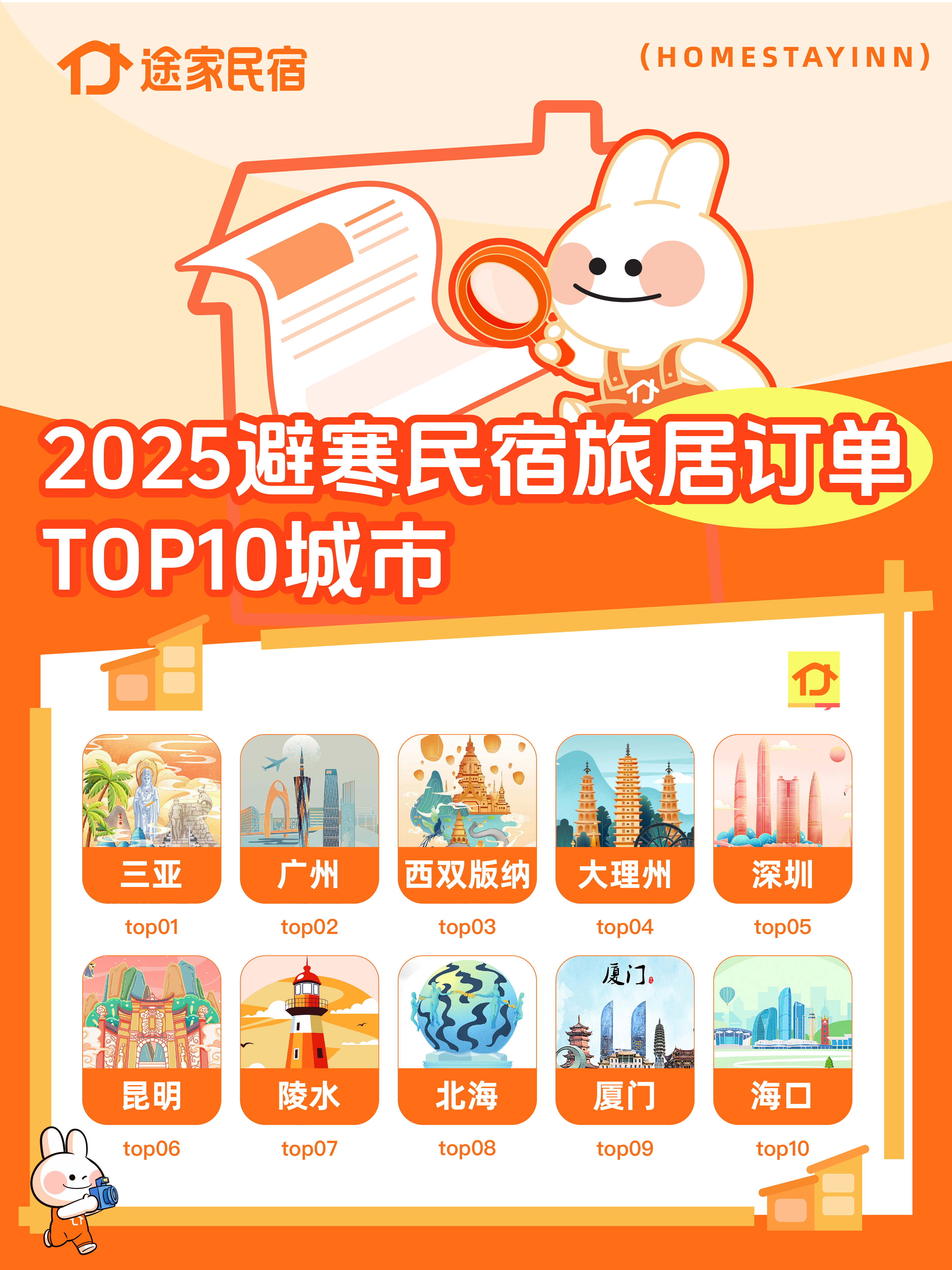 途家数据显示,2025年10月9日至2026年4月30日,连续入住7天及以上的旅居订单量TOP10城市为三亚、广州、西双版纳、大理州、深圳、昆明、陵水、北海、厦门、海口。