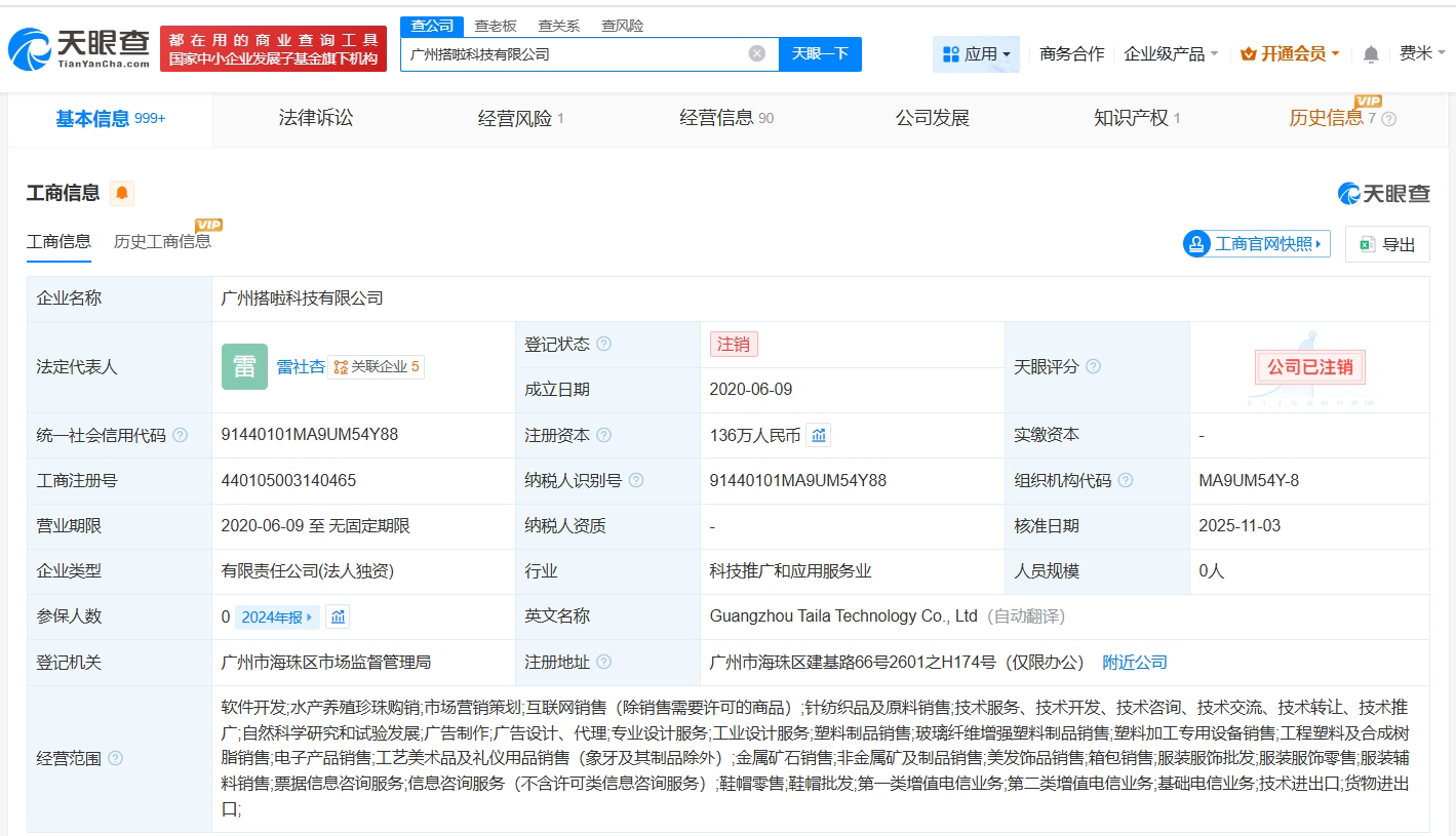 公开资料显示,广州搭啦科技有限公司成立于2020年6月,法定代表人为雷社杏,注册资本达136万元人民币。该公司经营范围呈现多元化特征,既涵盖软件开发、互联网销售等科技业务,又涉及水产养殖珍珠购销、市场营销策划等跨界领域。