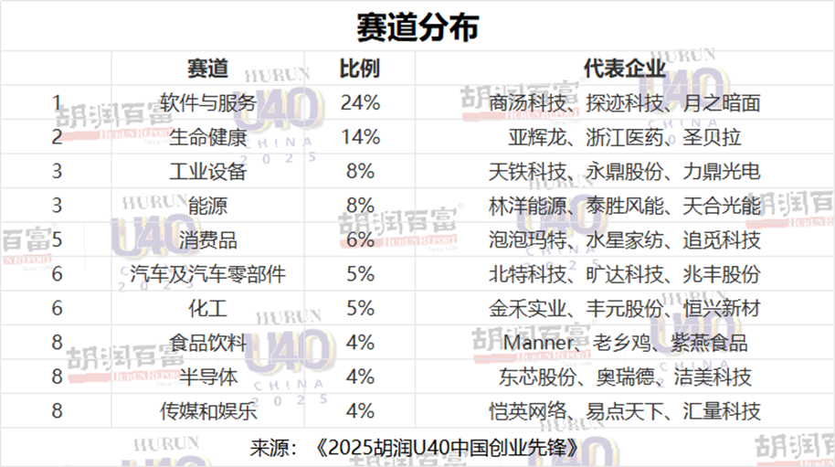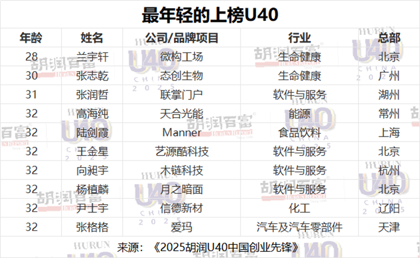 《2025胡润U40中国创业先锋》的上榜者中,男女占比85%和15%。28%销售软件或服务,72%销售实体产品。平均年龄37岁,平均在28岁时创办了他们的企业。