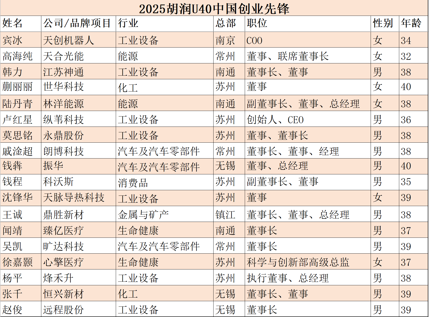 《2025胡润U40中国创业先锋》发布,公司或项目总部位于江苏的18人上榜
