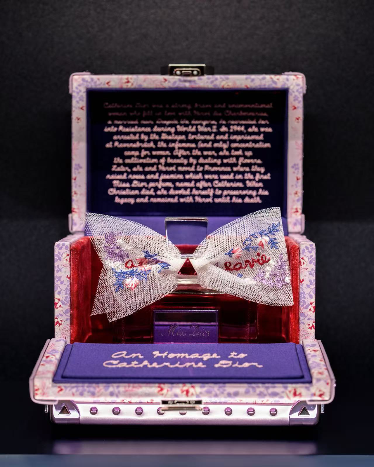 同时展出的还有美国艺术家朱迪·芝加哥为迪奥小姐香水创作的香氛收藏箱,上面绘满了繁花图案,既致敬了迪奥先生的妹妹,又融入了艺术家自己的风格。