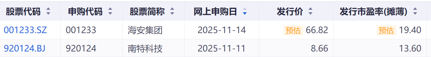 据同花顺iFinD,下周(11月10日-14日)有2只新股申购,分别是南特科技(11月11日周二)和海安集团(11月14日周五)。