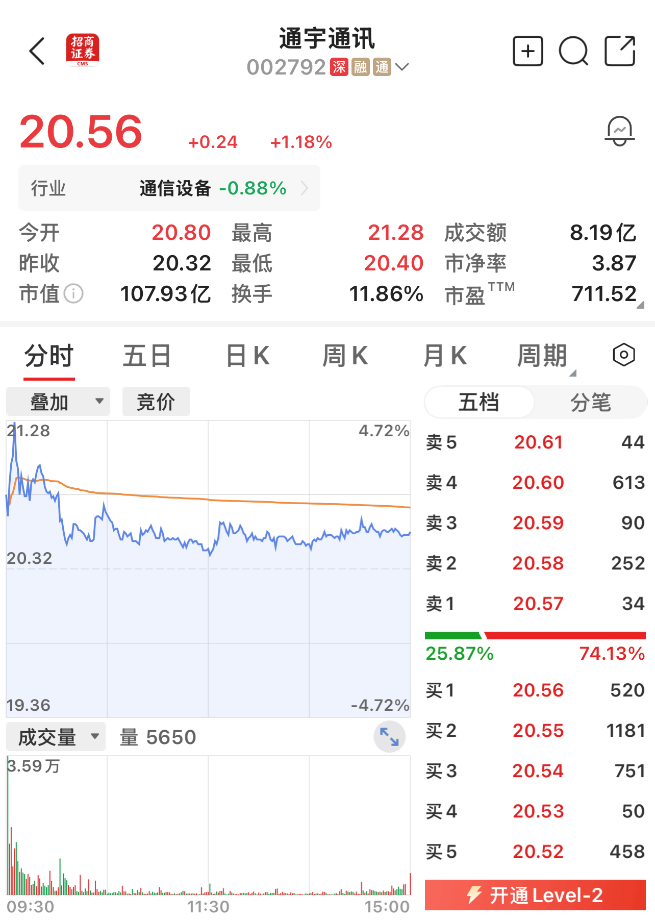 通宇通讯市值107.93亿元。