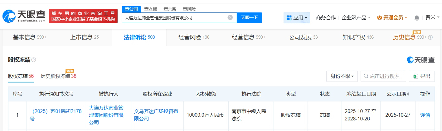 大连万达商管1亿股权遭冻结,涉义乌万达广场项目