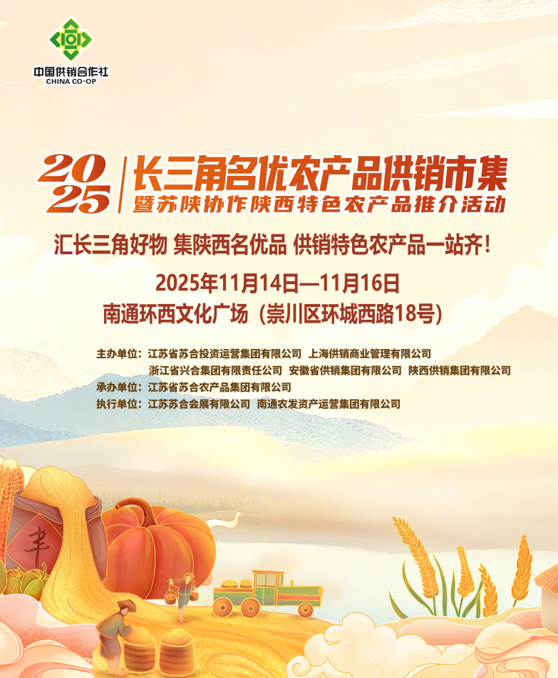 “汇长三角好物,集陕西名优品,供销特色农产品一站齐!”11月14日—16日,2025长三角名优农产品供销市集暨苏陕协作陕西特色农产品推介活动将在南通环西文化广场(崇川区环城西路18号)开幕。本次活动汇聚江苏、上海、浙江、安徽、陕西五地3000余款优质农产品,欢迎广大市民朋友前来参观选购,共同参与这场贯通东西、城乡融合的农产品盛会。