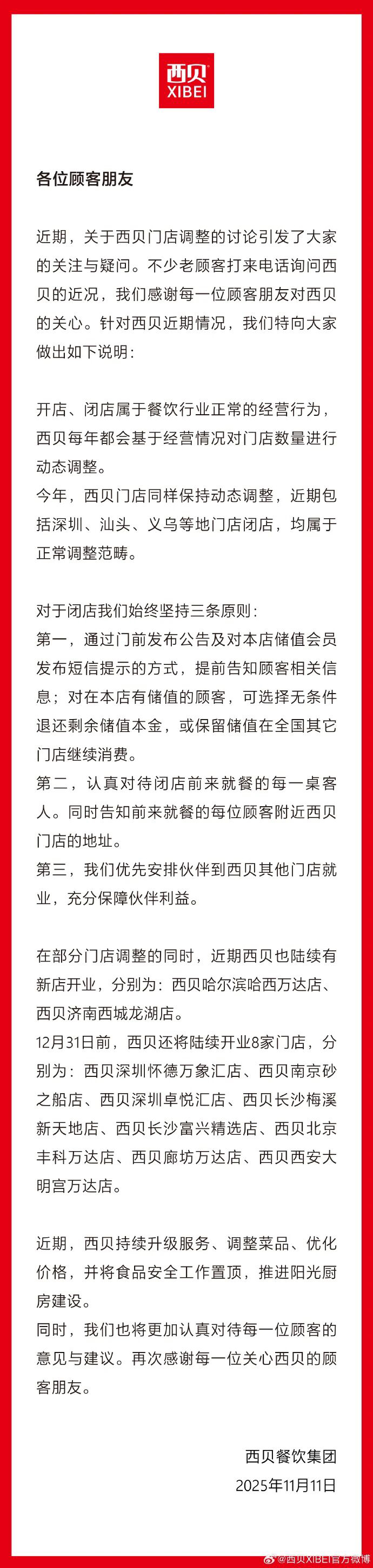 11月11日8:30,西贝在官方微博发布声明,回应称:开店、闭店属于餐饮行业正常的经营行为,西贝每年都会基于经营情况对门店数量进行动态调整。今年,西贝门店同样保持动态调整,近期包括深圳、汕头、义乌等地门店团店,均属于正常调整范畴。近期陆续有新店开业。