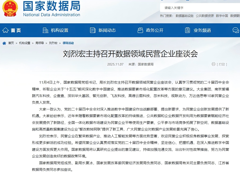 11月4日,国家数据局局长刘烈宏主持召开了数据领域民营企业座谈会,释放出一个明确的信号:中国数据要素市场正从“制度构建期”加速迈进“价值释放期”,并将出台针对性的政策措施,以支持民营数据企业的发展。