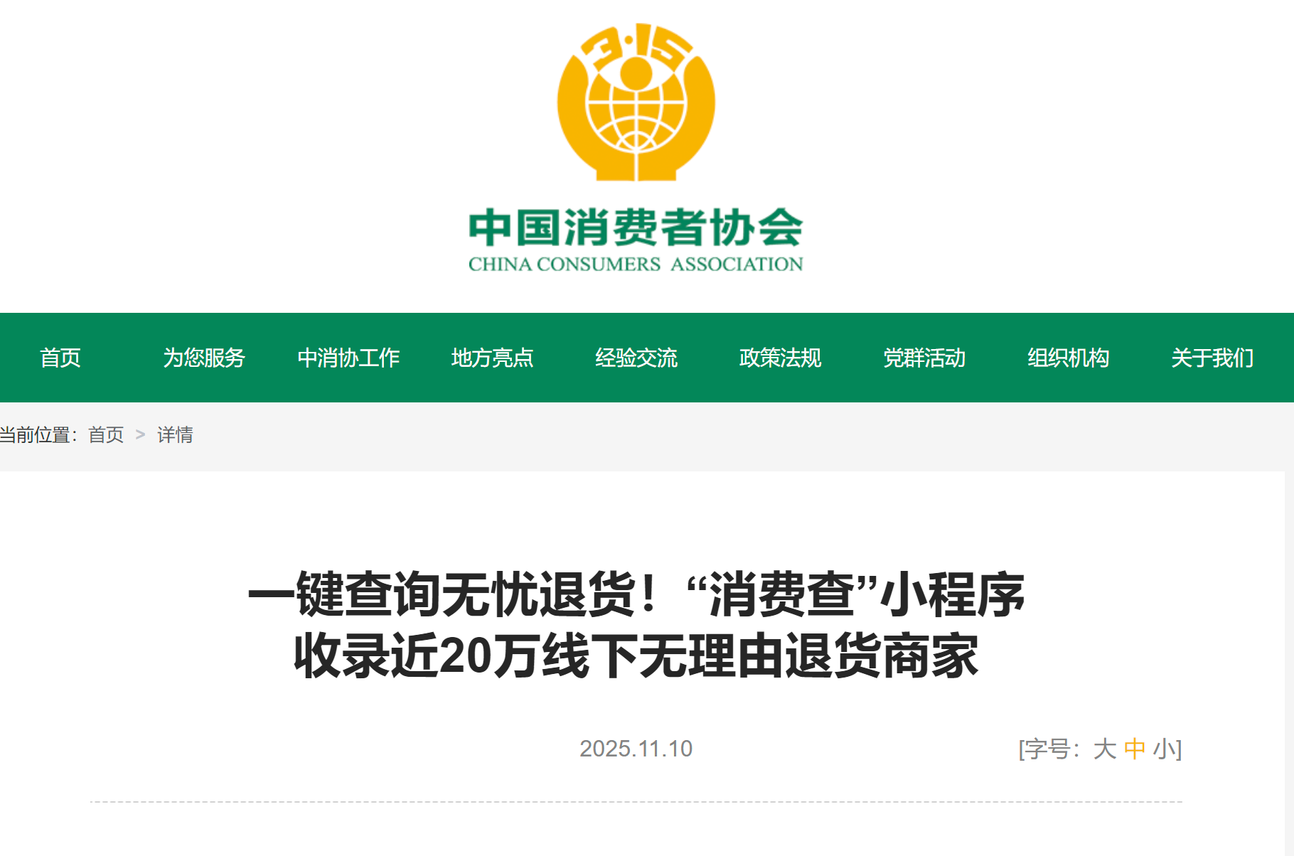 11月11日,记者从中消协官网获悉,“消费查”上线运行六个月来,入驻商家近20万家,支持线下无理由退货的商品品类涵盖家用电器、服装鞋帽、房屋建材等十一大类,退货期限从7天至一年不等。据悉,“消费查”由市场监管总局支持指导、中消协开发,系线下无理由退货商家查询平台,于5月7日上线试运行。