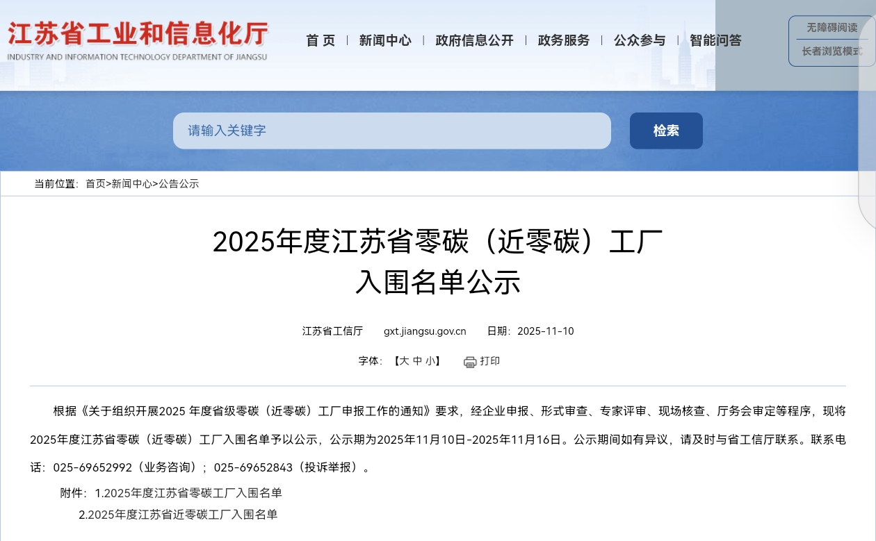 11 月 12 日,记者从江苏省工信厅获悉,根据《关于组织开展2025 年度省级零碳(近零碳)工厂申报工作的通知》要求,经企业申报、形式审查、专家评审、现场核查、厅务会审定等程序,现将2025年度江苏省零碳(近零碳)工厂入围名单予以公示,公示期截至2025年11月16日。