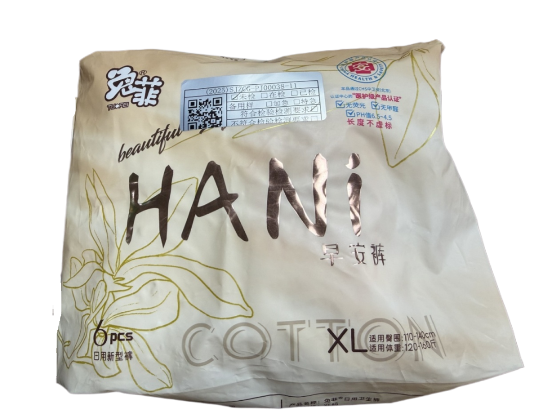 40批次产品外观包装均符合标准要求,但部分产品标签标识存在不规范情况。具体包括:“兔菲®日用卫生裤”适用腰围最大值实测109cm,低于其标注尺码加大码(XL)对应的标准要求(≥115cm),可能造成腰围处过紧,影响使用体验。