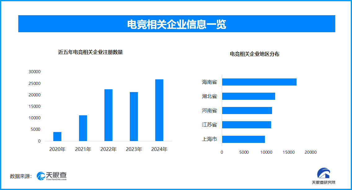 天眼查专业版数据显示,截至目前我国现存在业、存续状态的电竞相关企业超13.9万家。其中,2025年截至目前新增注册相关企业约4万余家,从企业注册数量趋势来看,近五年间,除2023年稍有下降外,电竞相关企业的注册数量呈现出逐年增长的态势,并在2024年达到顶峰。